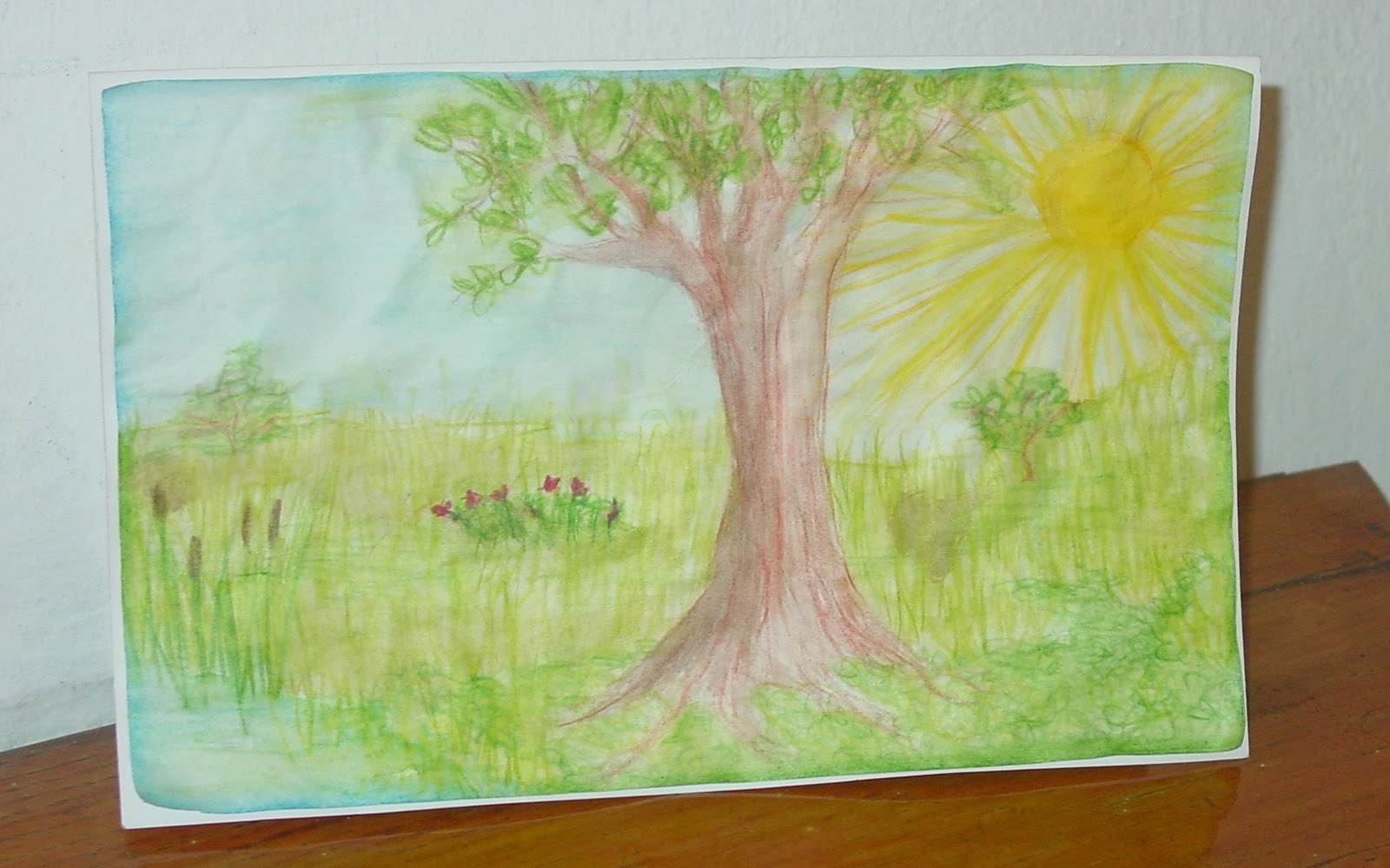 Tarjeta que pintó María, con lápices acuarelables, y me regaló hace un tiempo