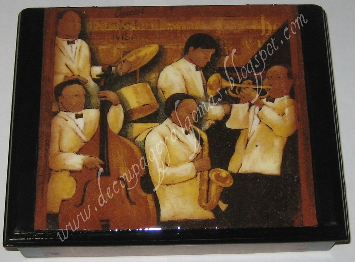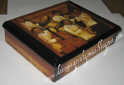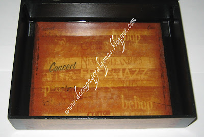 Tanto en la tapa, como en el interior, cubrí el decoupage con vidrio líquido.