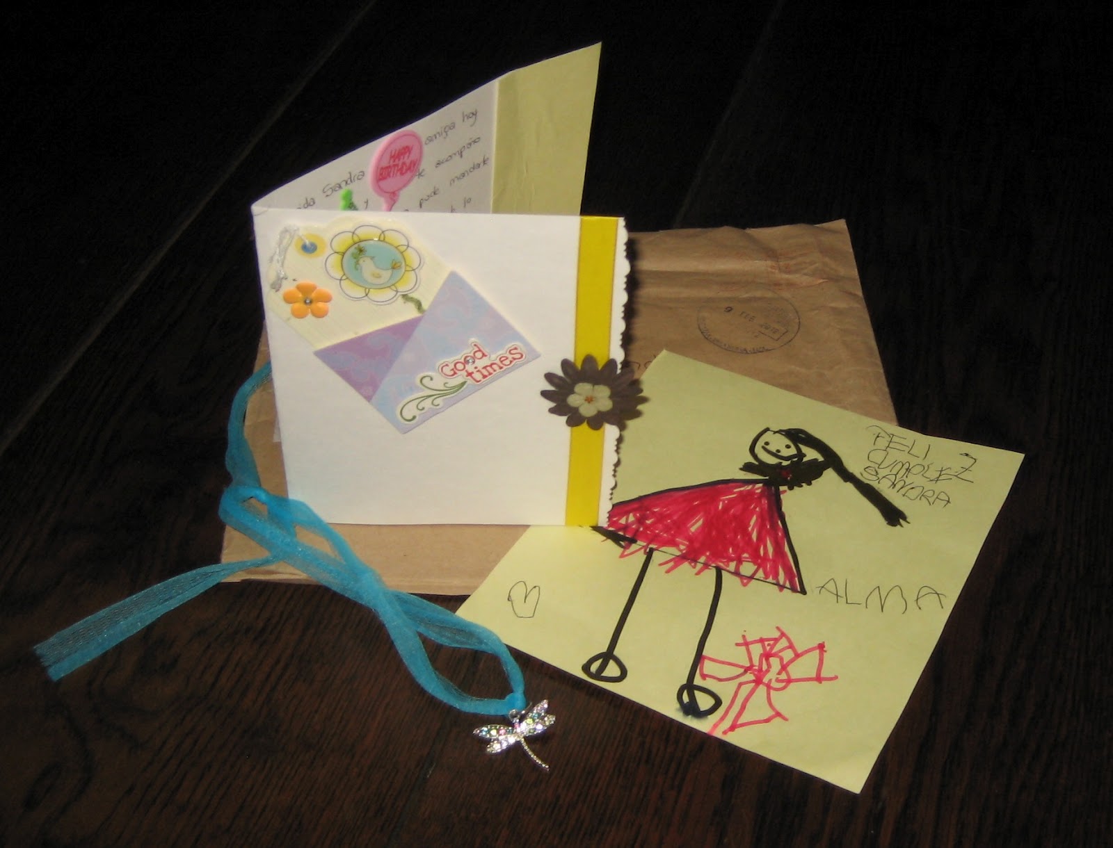 Patricia una preciosa tarjeta por mi cumpleaños hecha por ella, también un lindísimo dibujo que su hija Alma hizo para mí,